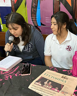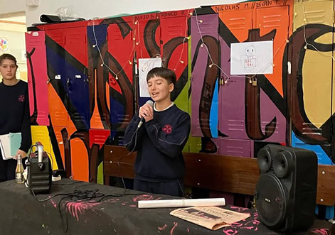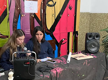 Noticias de la escuela, distintas columnas, música y entrevistas pudieron escucharse el viernes 9 de mayo en el patio de Secundaria durante el recreo.