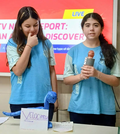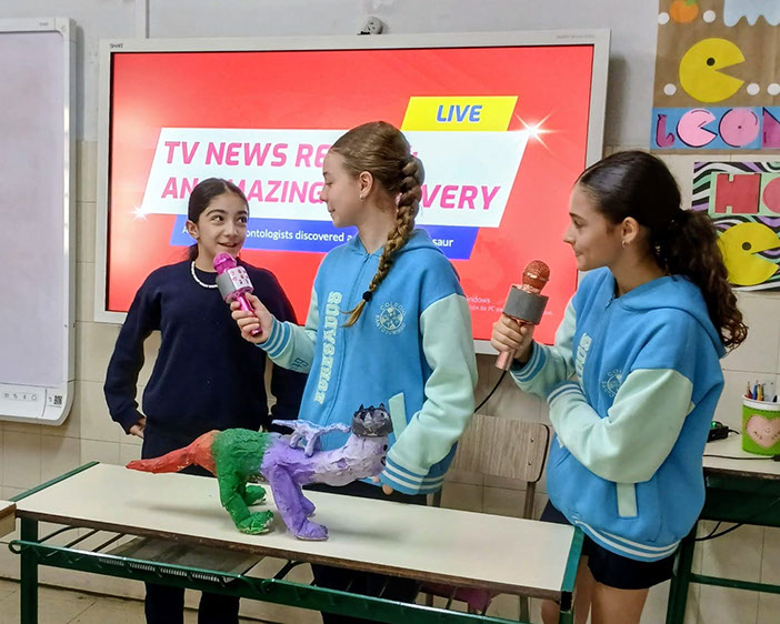 Los alumnos de 6to año de la Escuela Primaria asumieron el rol de paleontólogos, "descubriendo" fósiles de nuevos dinosaurios y presentando sus hallazgos en un noticiero escolar.