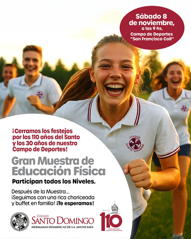 Y el sábado 8 de noviembre, desde las 9 h, nos reuniremos en nuestro Campo de Deportes “San Francisco Coll” para la Gran Muestra Anual de Educación Física, con la participación de todos los Niveles, cerrando así los festejos por los 110 años del Colegio y los 30 años de nuestro Campo de Deportes.